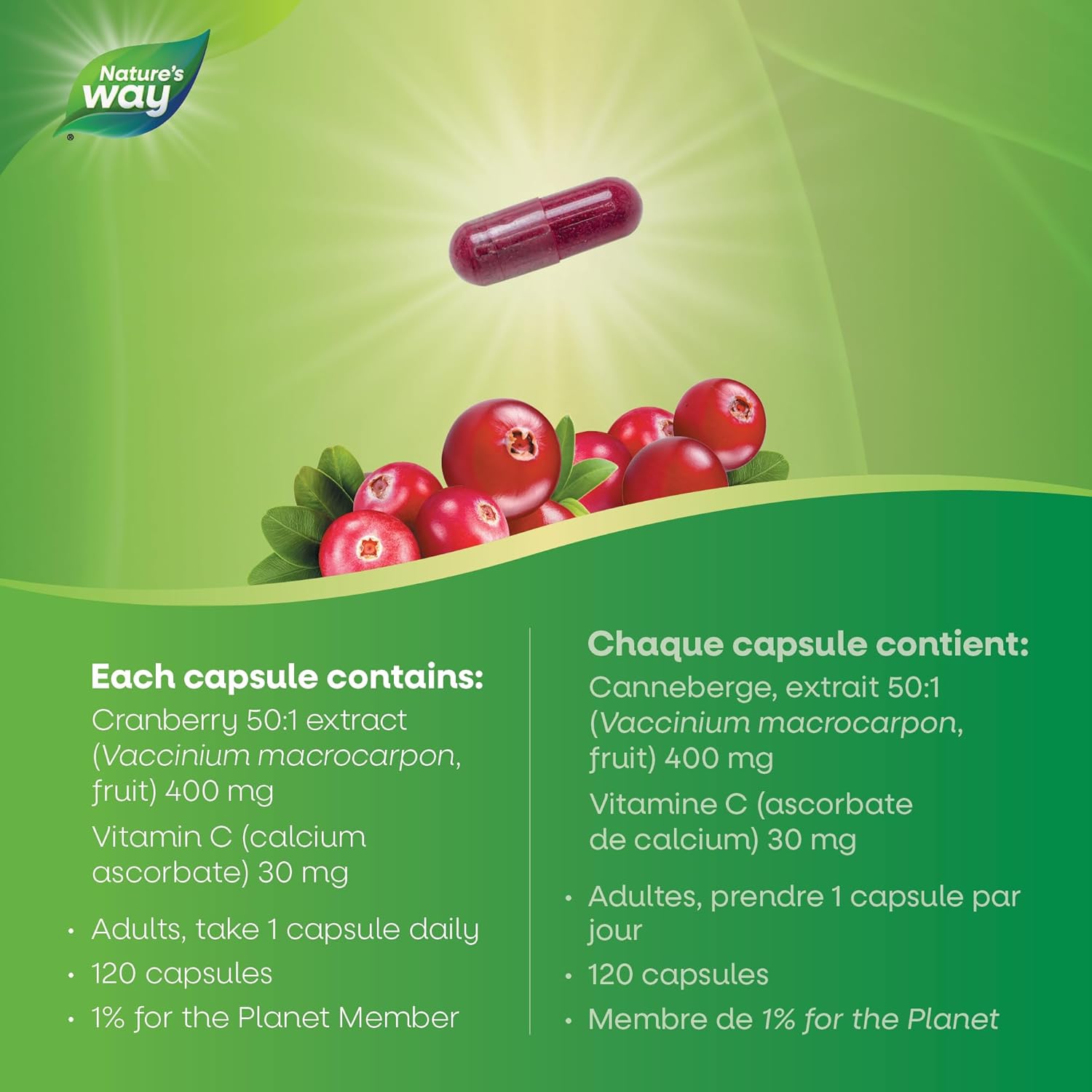 Nature’s Way 蔓越莓萃取膠囊採用優質蔓越莓萃取物製成,有助於預防復發性泌尿道感染 (UTI)。每日只需一顆膠囊,即可維持您的泌尿健康。每粒素食膠囊富含 400 毫克 50:1 蔓越莓萃取物,並添加維生素 C。