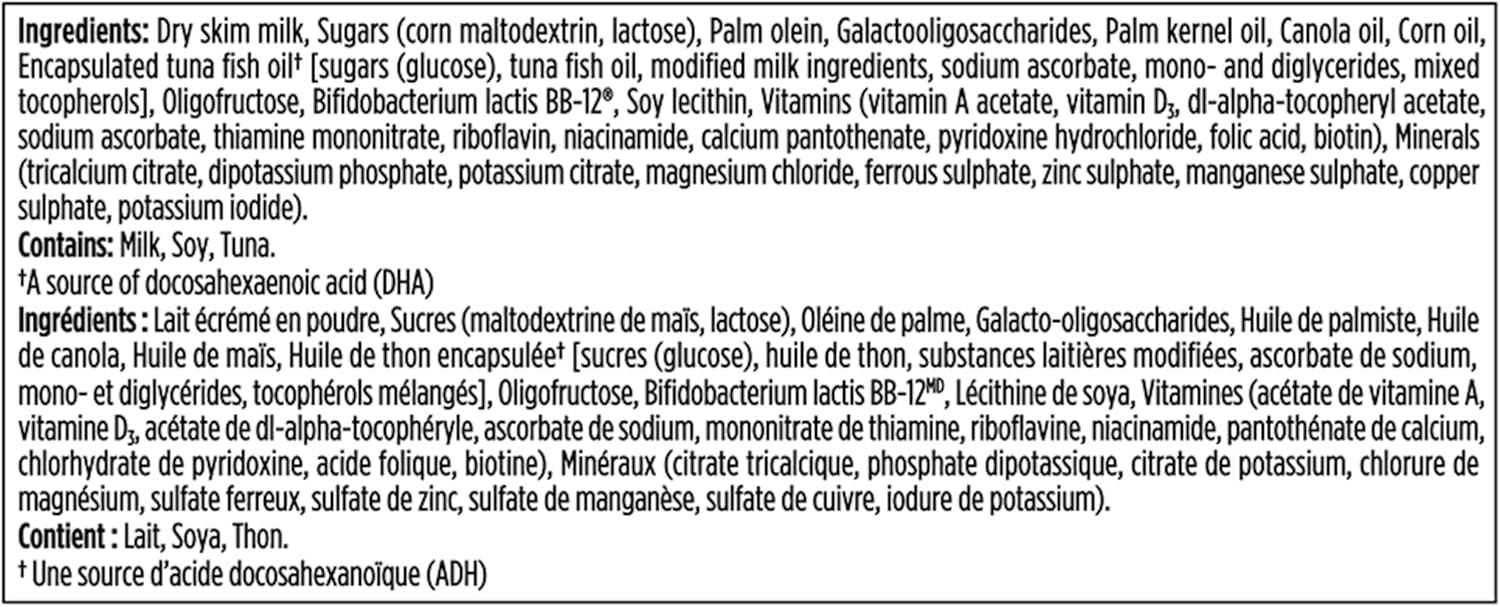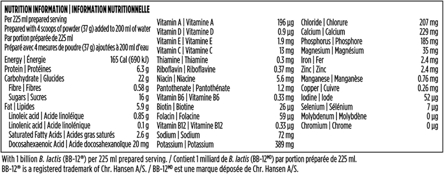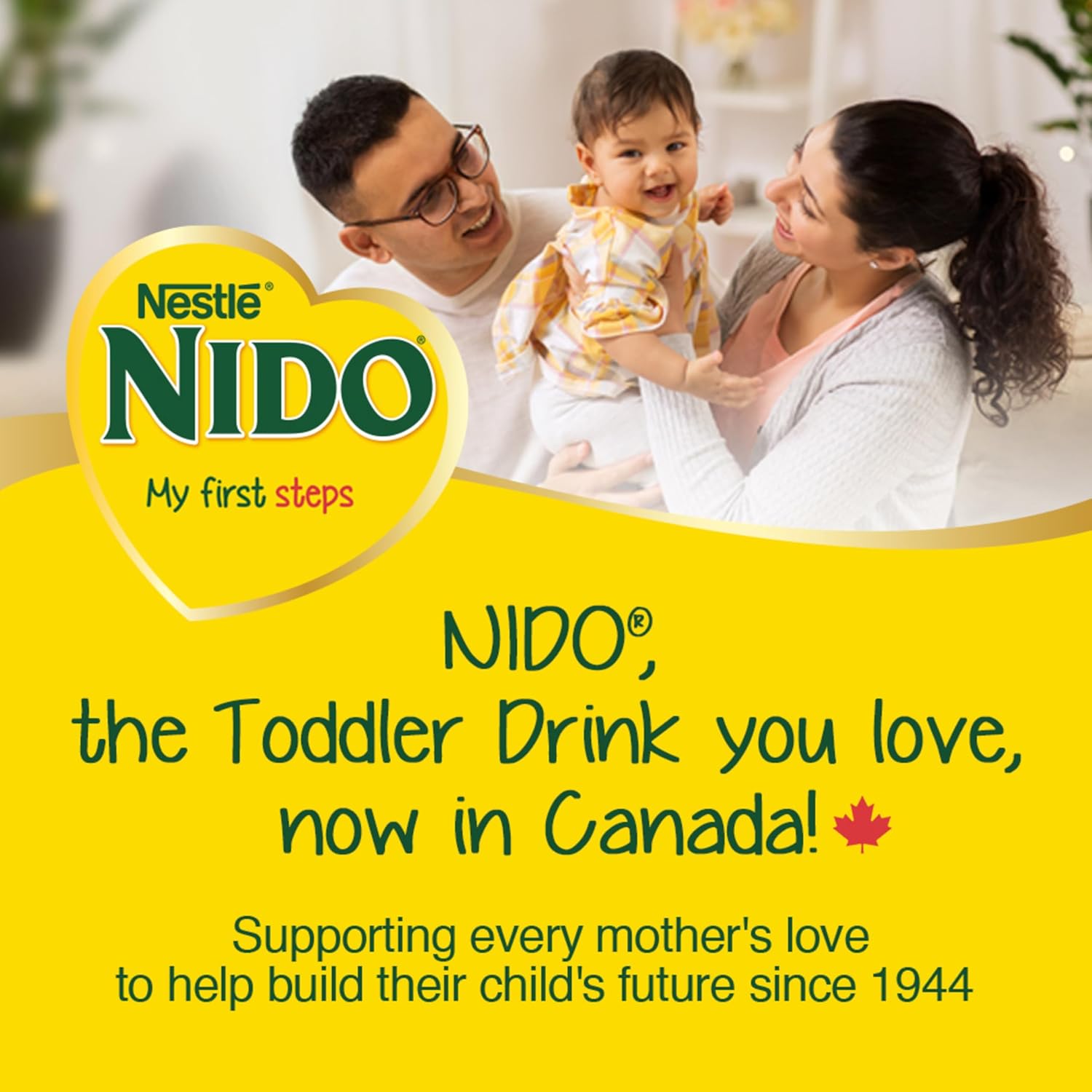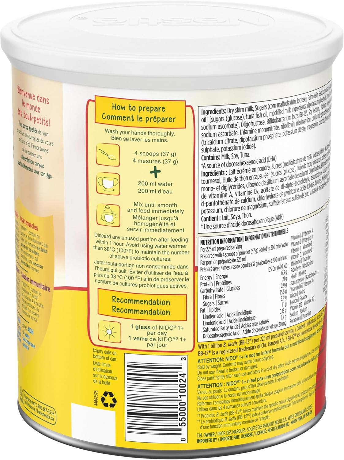 NIDO 1+ 是一種以牛奶為基礎的營養補充劑,專為補充1-3歲幼兒的營養需求而配製。 NIDO 1+ 富含鈣和維生素D,有助於強健骨骼和牙齒,並富含鎂,有助於維持正常的肌肉功能。它還含有維生素A、鋅和益生菌乳雙歧桿菌*,有助於維持寶寶免疫系統的正常功能。此外,它還含有DHA,有助於維持正常的大腦發育**。這款營養補充飲品經清真認證,不添加蔗糖***。 NIDO是全球媽媽們青睞的國際幼兒奶粉品牌,現已在加拿大上市。全球平均每秒消費800杯NIDO。沖調方法:將4匙(37克)奶粉加入200毫升水中,攪拌至順滑。立即飲用。