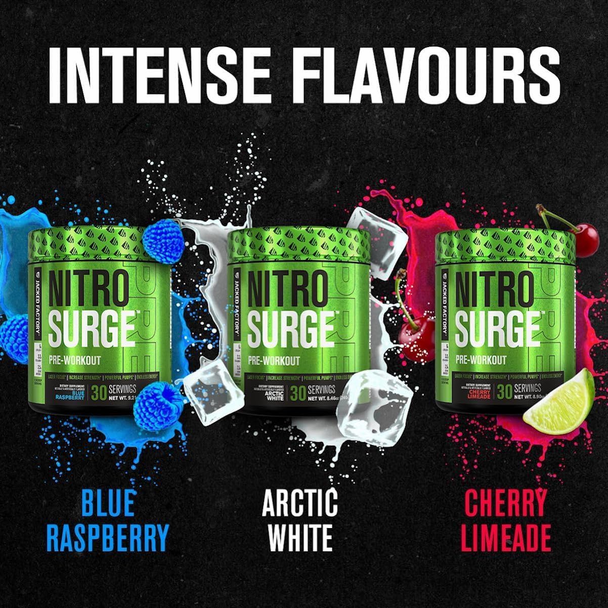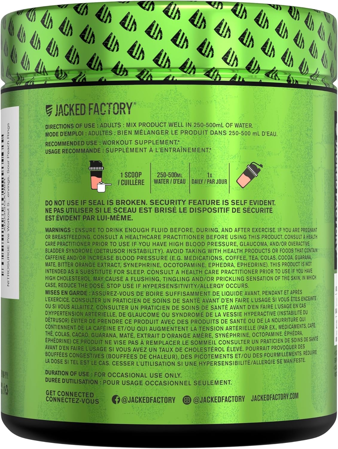 Pre Workout Powder for Energy, Strength, & Blood Flow: Nitrosurge pre workout is formulated with evidence-based ingredients that boost nitric oxide (NO), energy, and strength for hours on end. Delivering peak performance, laser focus, and intense pumps every single training session..Best Pre-Workout for Athletes & Gym-Goers: We went the extra mile to create a science-backed, pre workout powder that helps improve body composition and athletic performance without the side effects of harsh stimulants and banned ingredients. Nitrosurge contains clean, effective, and pure ingredients that athletes and gym-goers can count on, including L Citrulline, Betaine Anhydrous, Beta Alanine, Caffeine, L Theanine, and more..Nitric Oxide Boosting Pre Workout: Nitrosurge elevates muscle pumps during training thanks to clinical doses of L Citrulline and betaine anhydrous — two proven nitric oxide boosters. Feel the satisfaction of skin-tearing pumps every time you hit the gym with this best-rated pre-workout supplement..Ingredients Backed by Science. Nitrosurge pre-workout powder optimizes the key components of athletic performance — energy, mental sharpness, focus, muscle pumps, strength, and stamina — with ingredients that are backed by science and clinical research..Manufactured in a cGMP-Certified Facility: Unlike many dietary supplements, all Jacked Factory products are manufactured under stringent quality control standards to ensure proper purity and potency. This formula is completely free of harsh chemicals, fillers, and artificial food dyes.Manufacturer: Jacked Factory. Place of Business: Jacked Factory. Item model number: JF016. Product Dimensions: 8 x 6 x 4 cm; 30 g. ASIN: B07ZG2T88B. Best Sellers Rank: #47 in Health & Personal Care (See Top 100 in Health & Personal Care)#1 in Beta-Alanine Nutritional Supplements. Date First Available: Nov. 2 2019. Country of origin: Canada. Customer Reviews: 4.3 4.3 out of 5 stars 18,927 ratings.