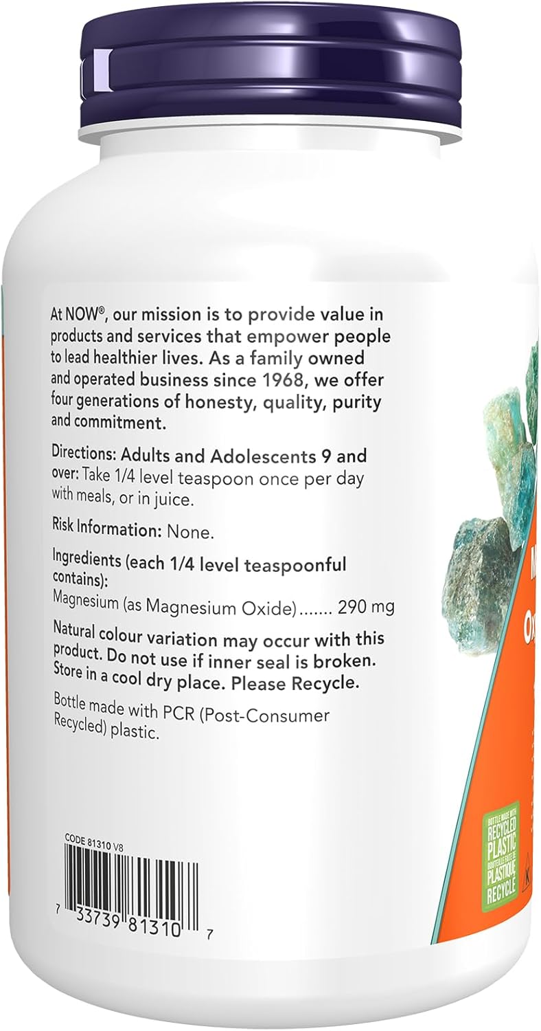 氧化鎂源自古老的海洋沉積物,富含元素鎂(平均含量達58%)。鎂是一種必需礦物質,在活化胺基酸進行蛋白質生物合成中起著關鍵作用,並且高度濃縮於細胞內液和骨骼。我們的NOW天然有機補充劑是確保您和您的家人獲得必需維生素、礦物質和營養素,以保持每日最佳健康狀態的有效方法。自2000年以來,NOW品牌一直致力於支持加拿大人,並致力於提供能夠幫助人們過更健康生活的產品。加拿大70%的NOW產品在安大略省圭爾夫市生產或包裝,並僱用了來自全國各地的數百名加拿大員工。 NOW每月進行31,000次品質檢測,以確保您以最優惠的價格獲得最高品質的補充劑。我們承諾-標籤上的內容與瓶中的內容完全一致。