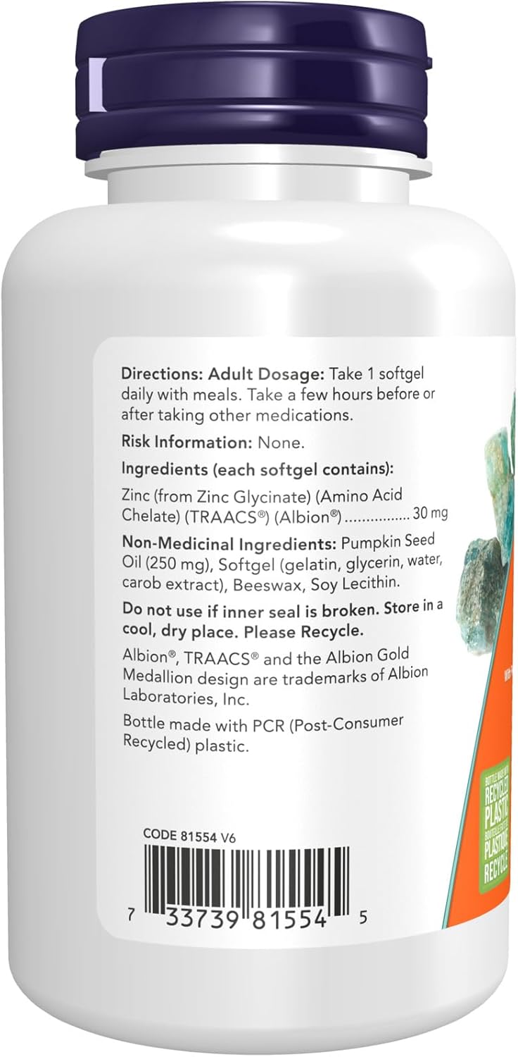 鋅是數百種與蛋白質和碳水化合物代謝、RNA/DNA合成以及細胞間信號傳導相關的酶促反應中的礦物質輔助因子。鋅對人體許多器官和系統的正常功能至關重要,有助於維持健康的免疫、骨骼、神經和內分泌功能。膳食中鋅的生物利用度相對較低,因此NOW甘氨酸鋅(也稱為雙甘氨酸鋅)經過螯合處理,以提高其吸收率和生物利用度。 NOW獨家推出甘胺酸鋅軟膠囊,並添加南瓜籽油作為健康增效劑。我們的NOW天然有機補充劑是確保您和您的家人獲得每日最佳健康所需的必需維生素、礦物質和營養素的有效方法。自2000年以來,NOW品牌一直致力於支持加拿大人,並致力於提供能夠幫助人們過更健康生活的產品。加拿大70%的NOW產品在安大略省圭爾夫市生產或包裝,為加拿大東海岸至西海岸的數百名員工提供就業機會。 NOW 每月進行 31,000 次品質檢測,確保您以最優惠的價格獲得最高品質的補充劑。我們承諾:標籤上的內容與瓶中內容完全一致。
