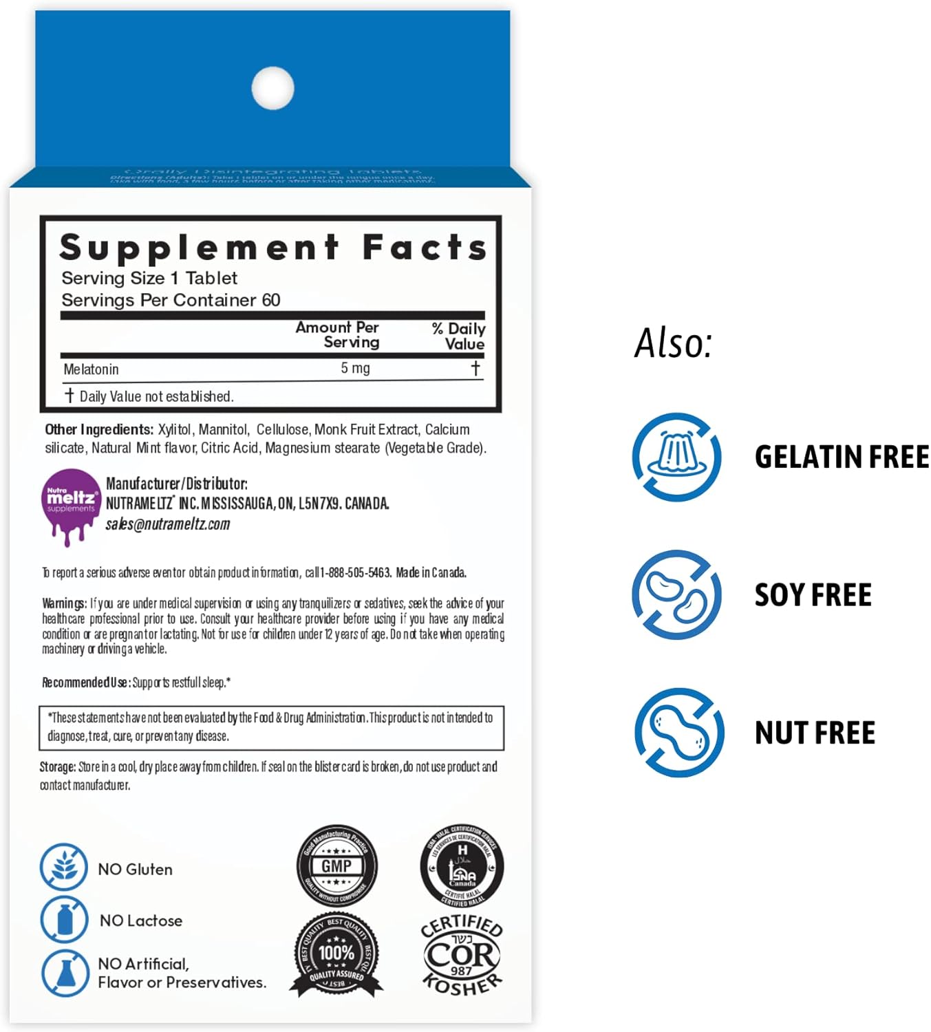 Nutrameltz 褪黑激素 5 毫克 – 天然助眠褪黑激素補充劑,緩解時差反應,幫助調節睡眠週期,速溶片,幫助您安睡 – 美味薄荷味(60 片)
