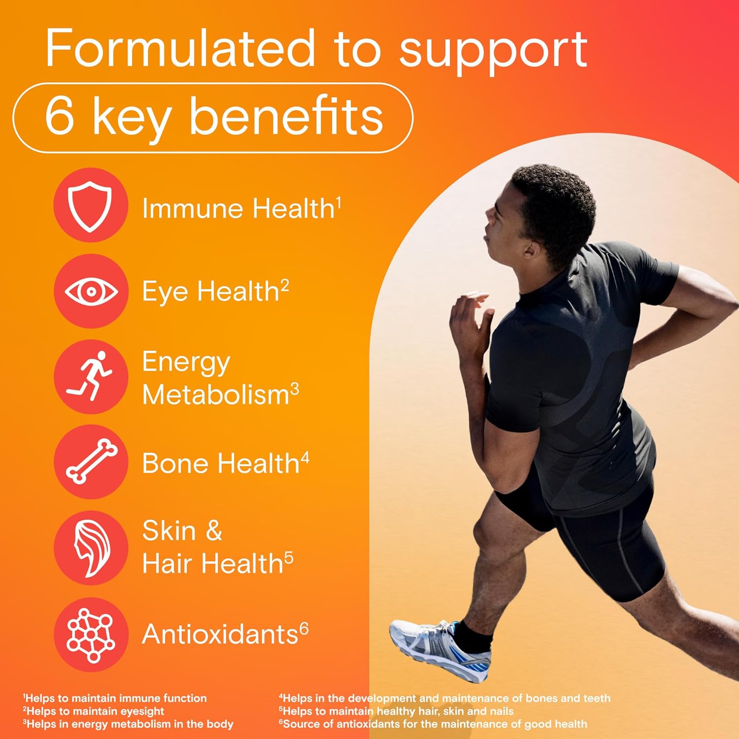 使用 One A Day's Multi+ 免疫支持複合維生素軟糖(男女適用)來支持您的免疫系統。特殊配方的複合維生素,旨在提供日常營養支持和日常免疫功能支持。 One A Day Multi+ 免疫支持維生素含有多種必需維生素和礦物質,有助於支持:免疫健康 - 幫助維持免疫功能骨骼健康 - 幫助骨骼和牙齒的發育和維持眼睛健康 - 幫助維持視力健康的皮膚和頭髮 - 保持健康的頭髮、皮膚和指甲新陳代謝 - 幫助體內的能量代謝有益健康的抗氧化劑 - 維持身體健康的抗氧化劑您的身體可能需要必需維生素,如 A、B6、B12、C、D 和 E、生物素、鋅和硒,One a Day's Multi+ 成人免疫軟糖在美味的咀嚼軟糖中含有 13 種活性成分。服用 One A Day Multi+ 免疫支持補充軟糖是幫助您從內而外保持最佳狀態的另一種方法。它含有鋅、維生素 C 和維生素 D,有助於支持免疫功能;維生素 B6、B12 有助於體內能量代謝;維生素 D 有助於骨骼健康。每顆軟糖都富含您所需的必需維生素和礦物質,有助於保持身體健康,同時不含高果糖玉米糖漿、阿斯巴甜和人工甜味劑。何不把 One A Day Multi+ 成人免疫防禦複合維生素軟糖納入您的健康生活方式!成人服用方法:每日咀嚼一粒軟糖,與食物同服,服用其他藥物或天然保健品前或後幾小時服用。為確保本產品適合您,請務必閱讀並遵循標籤上的指示。