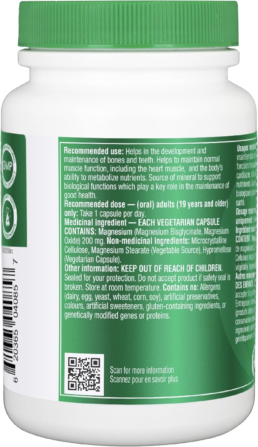 Organika 加拿大製造雙甘氨酸鎂 - 200 毫克,高吸收率,肌肉恢復,心臟支持,120 粒膠囊