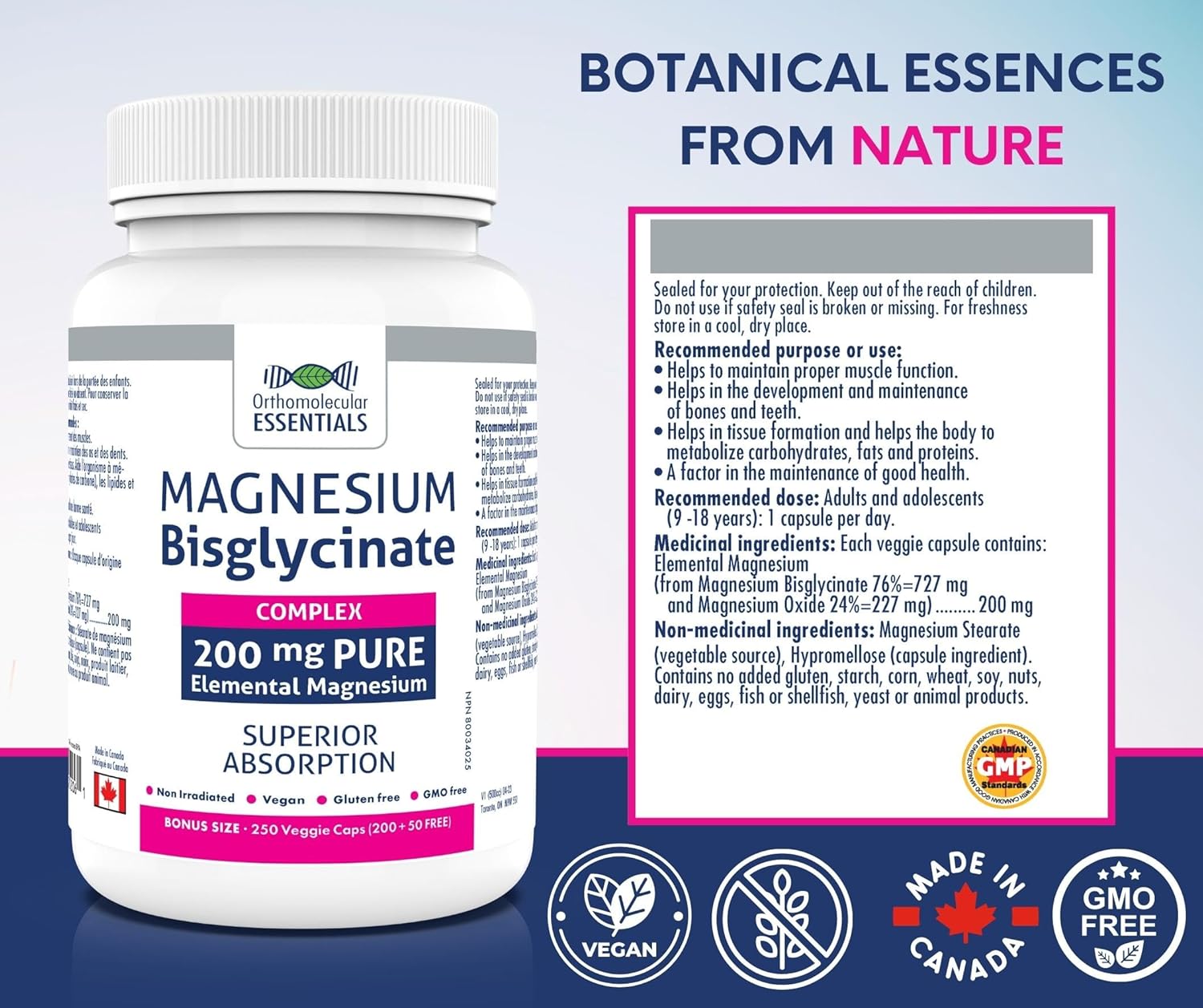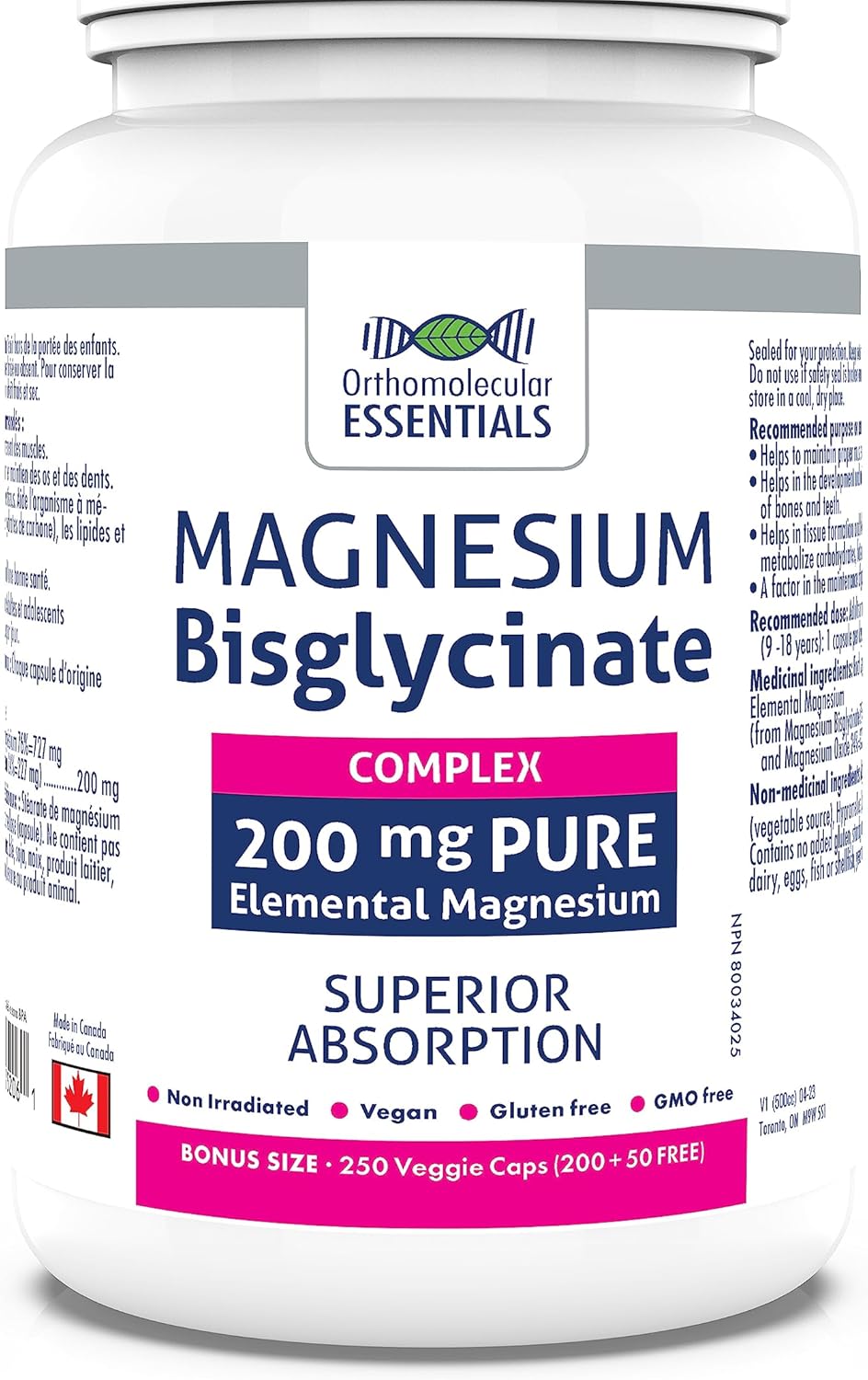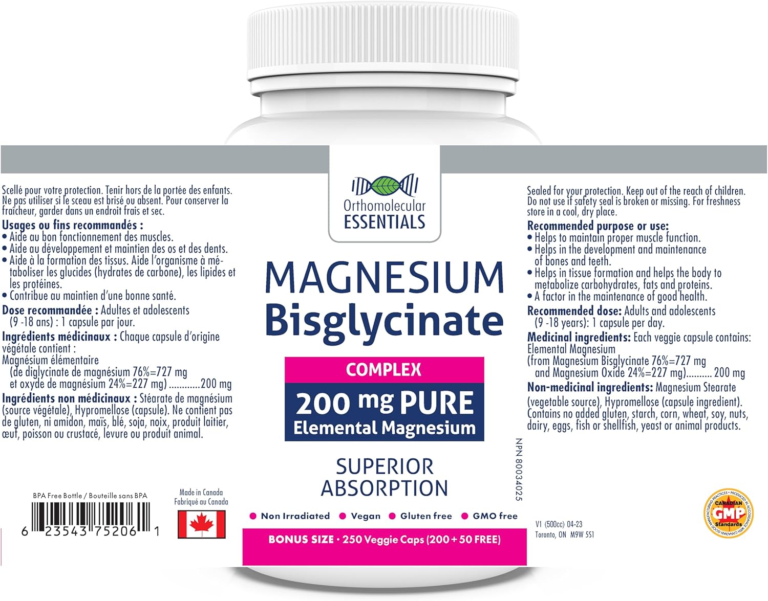 正分子必需品 – 雙甘氨酸鎂複合物 200 毫克,250 粒素食膠囊(250 天用量)– 元素鎂,有助於睡眠、骨骼健康和神經功能 – 非基因改造和無麩質