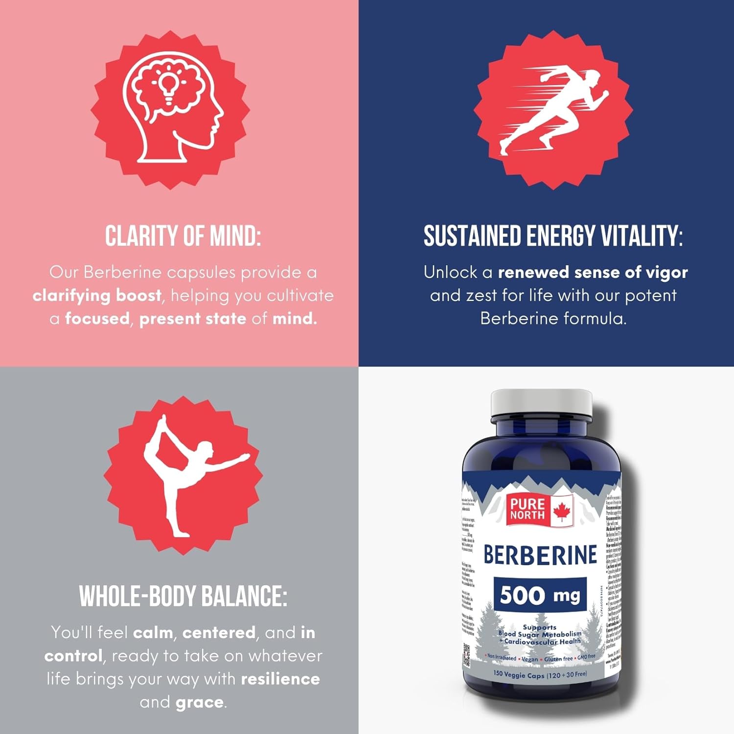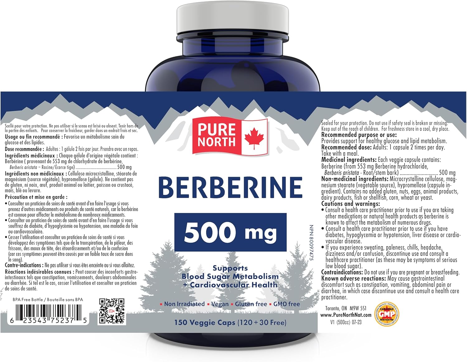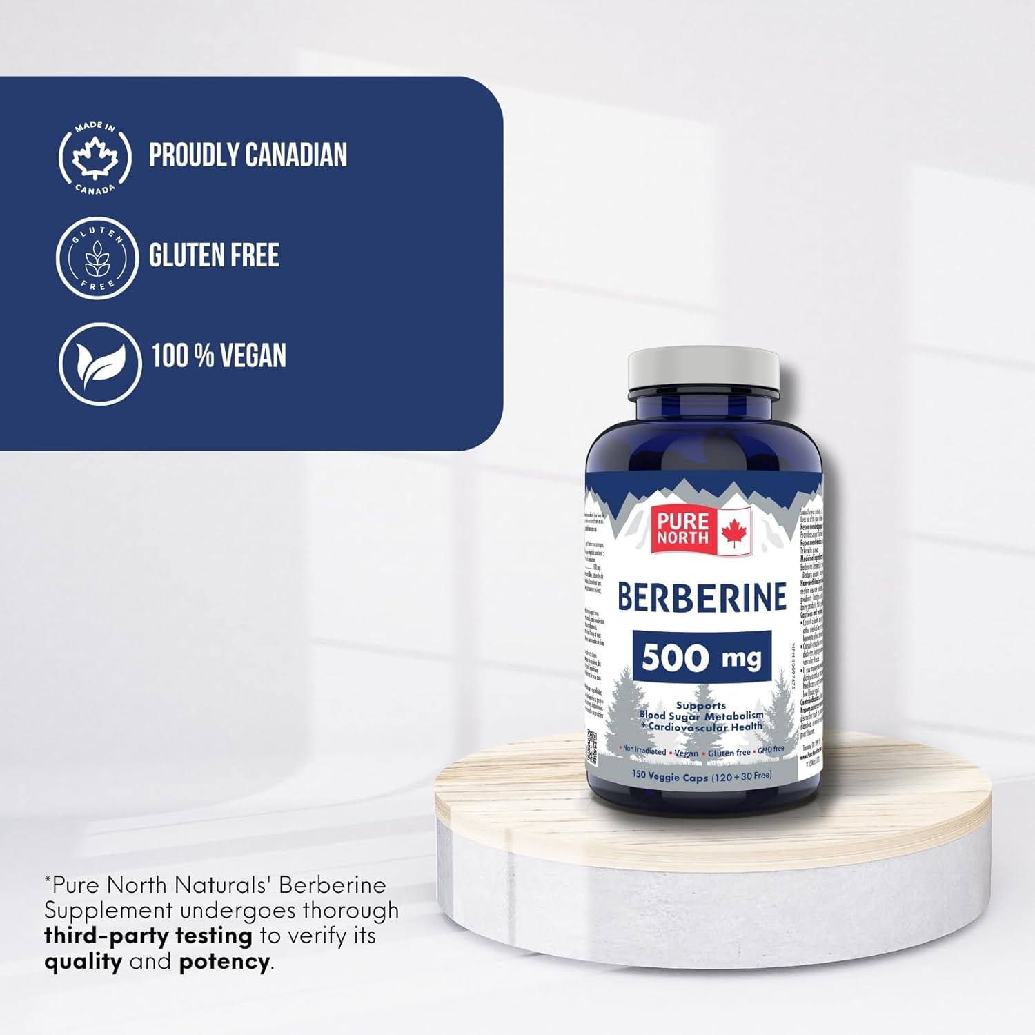 Pure North Naturals - 小蘗鹼 500 毫克,150 粒素食膠囊,75 天用量 - 支持血糖代謝 + 心血管健康和腸道健康 - 經第三方測試 - 加拿大配製和製造