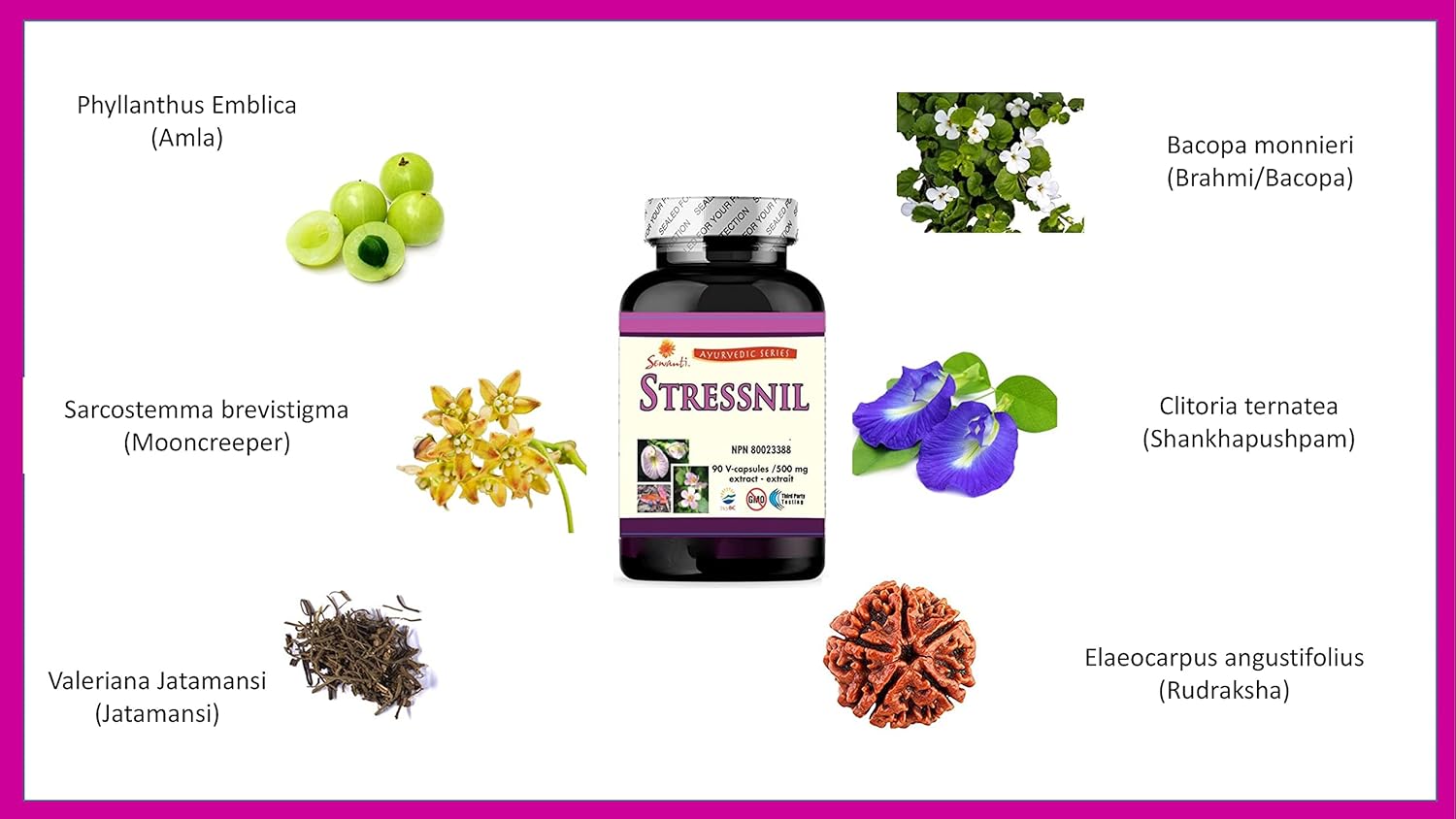 Stressnil 是一種高效能 35:1 草本萃取物,由 Sarcostemma brevistigma、Clitoria ternatea、Bacopa monnieria、Elaeocarpus tuberculatus、Phyllanthus emblica 和 Nardostachys jatamansi 組成。