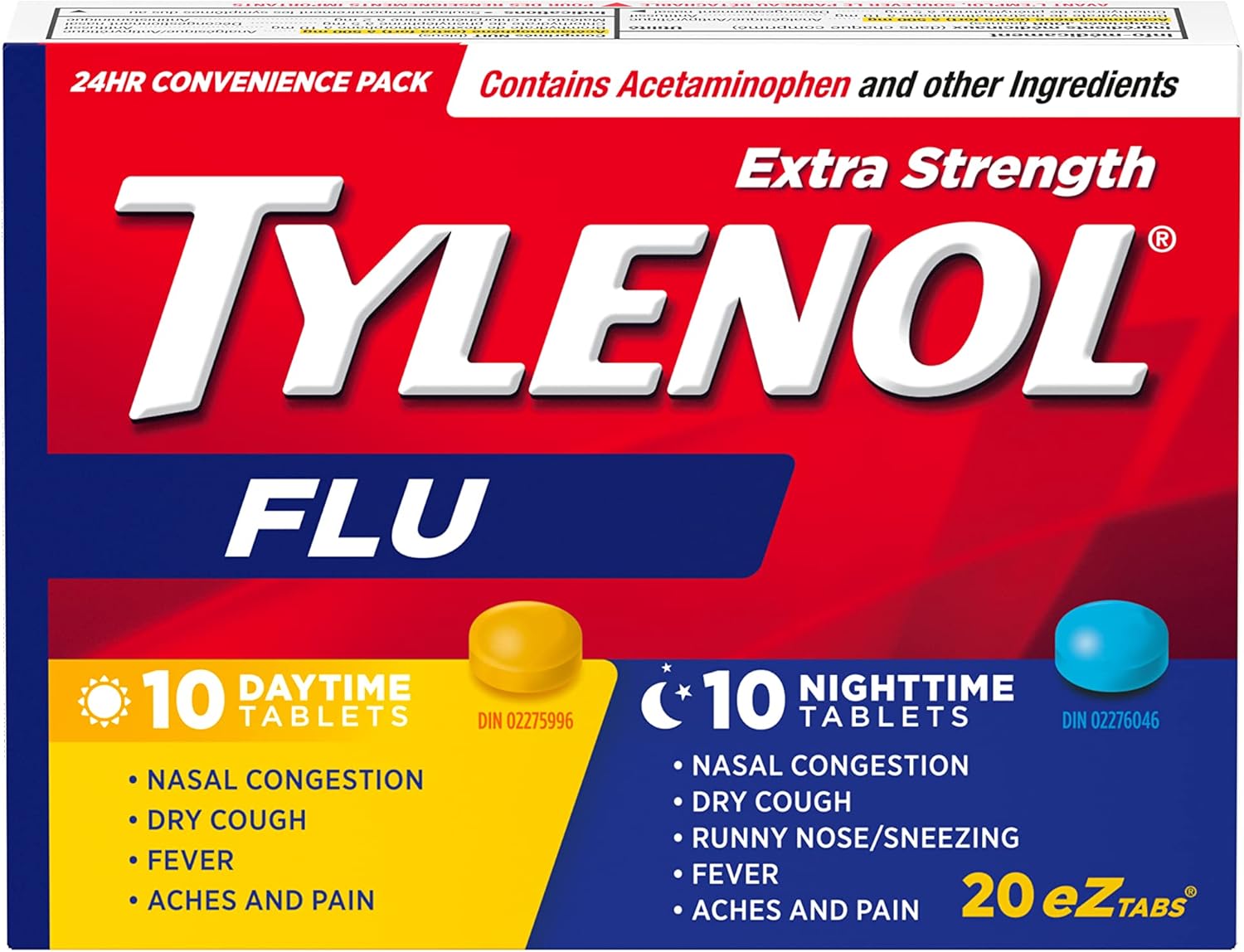 泰諾強效鼻竇炎 eZ 片,緩解鼻竇充血和其他鼻竇症狀,日夜適用,便捷裝,40 片泰諾強效日夜組合,24+16 片裝,有助於緩解日夜鼻竇症狀。快速有效地緩解感冒或流感引起的鼻竇相關疼痛和壓力、鼻竇性頭痛、鼻竇充血、全身疼痛以及流鼻水和打噴嚏(僅限夜間)等症狀,讓您呼吸更順暢。每片日夜藥片含有 500 毫克對乙醯氨基酚,有助於緩解疼痛和退燒,5 毫克鹽酸苯腎上腺素用於緩解鼻塞。夜間藥片還含有 2 毫克馬來酸氯苯那敏,作為抗組織胺藥,用於流鼻涕和打噴嚏。僅限成人使用(12 歲以上)。根據需要,每 4 小時服用 1-2 片。 24小時內請勿服用超過8粒膠囊。泰諾(Tylenol)是緩解流感症狀的最佳選擇。泰諾(Tylenol)強效日夜流感eZ片,20片裝,緩解日夜流感症狀。每片含500毫克對乙醯氨基酚(用於緩解疼痛和發燒)、10毫克氫溴酸右美沙芬(用於止咳)和5毫克鹽酸苯腎上腺素(用於緩解鼻塞)。夜間用藥片添加了2毫克馬來酸氯苯那敏(一種抗組織胺),用於緩解流鼻涕和打噴嚏。這些易於吞嚥的藥片可緩解鼻塞、乾咳、發燒和全身疼痛。強效泰諾日夜感冒藥EZTABS每包20片:10片日用藥片及10片夜用藥片。成人及12歲以上兒童,視需要每4小時服用1-2片日用藥片或夜間用藥片。 24小時內日用藥片或夜用藥片總量不得超過8片。