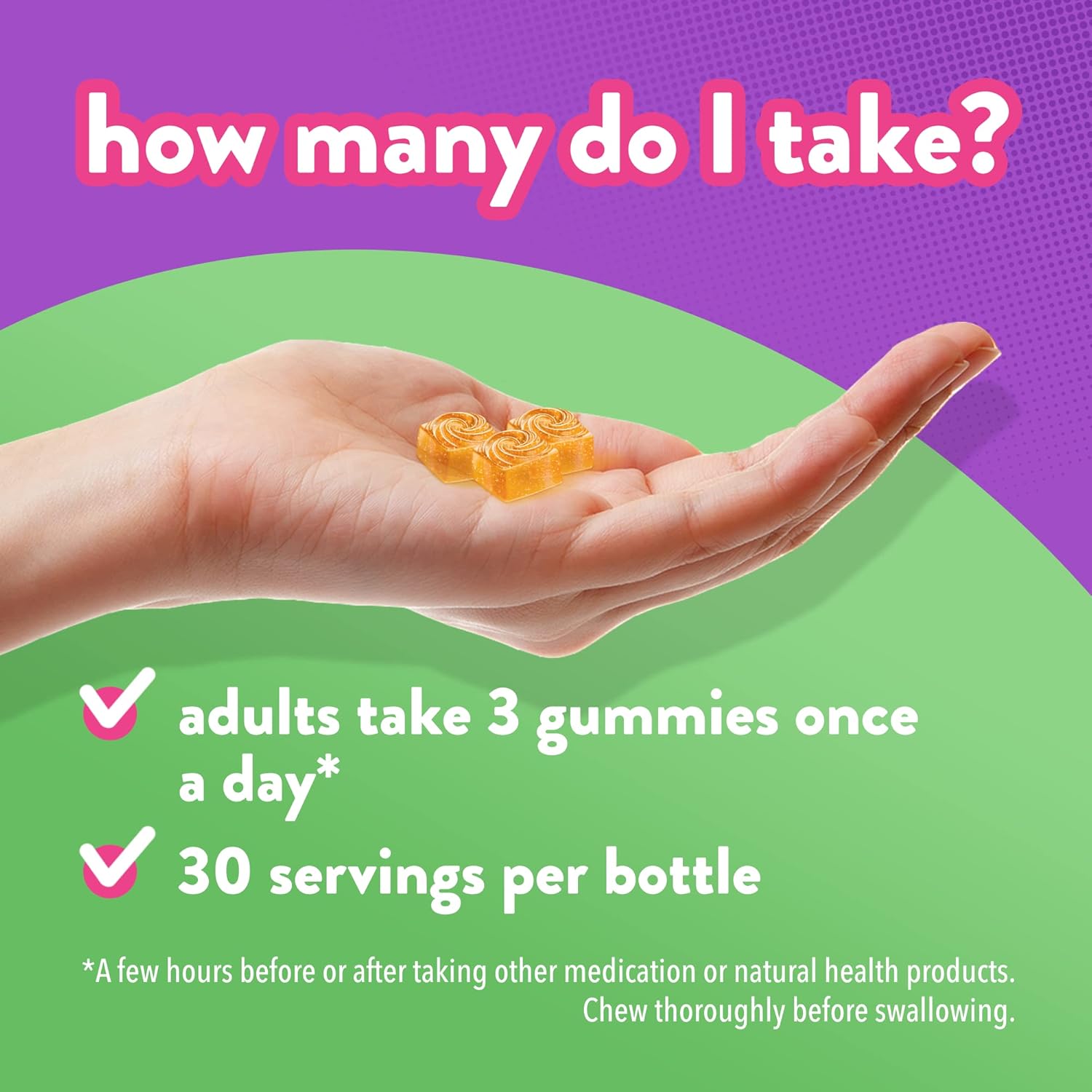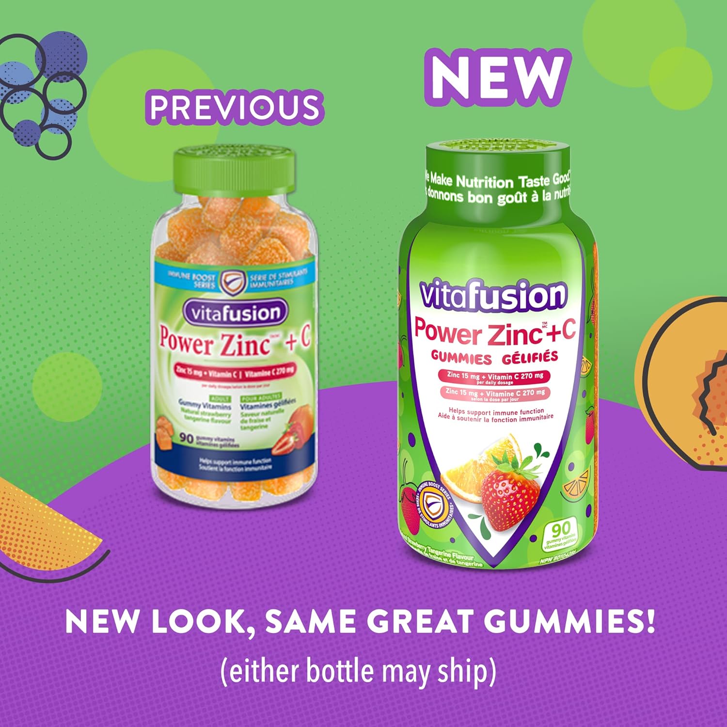 Vitafusion Power 鋅+C 成人維生素軟糖,讓營養美味可口。每份(3 粒軟糖)含有 15 毫克鋅和 270 毫克維生素 C,可增強您的免疫系統。鋅是一種人體必需的礦物質,天然存在於許多食物中,也添加到其他食物中,例如補充劑、感冒藥和一些非處方感冒藥中。這些維生素有助於增強免疫系統,並提高身體代謝營養素的能力。 Vitafusion 軟糖容易咀嚼,無需用水即可服用,更方便。我們易於服用的維生素軟糖採用美味的天然草莓橘子口味,是您補充能量的完美選擇,可幫助您保持愉悅心情,保持最佳健康狀態。我們的軟糖不含人工香料、高果糖玉米糖漿、合成 (FD&C) 色素,也不含麩質和乳製品,為您帶來愉悅的維生素體驗!