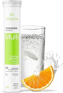 美味複合維生素+維生素C泡騰片:VitaLine複合維生素+1000毫克維生素C+生物素泡騰片,有助於維持身體吸收營養的能力,從而達到最佳能量水平和免疫功能。口味:橘子。每包20片(20份)。