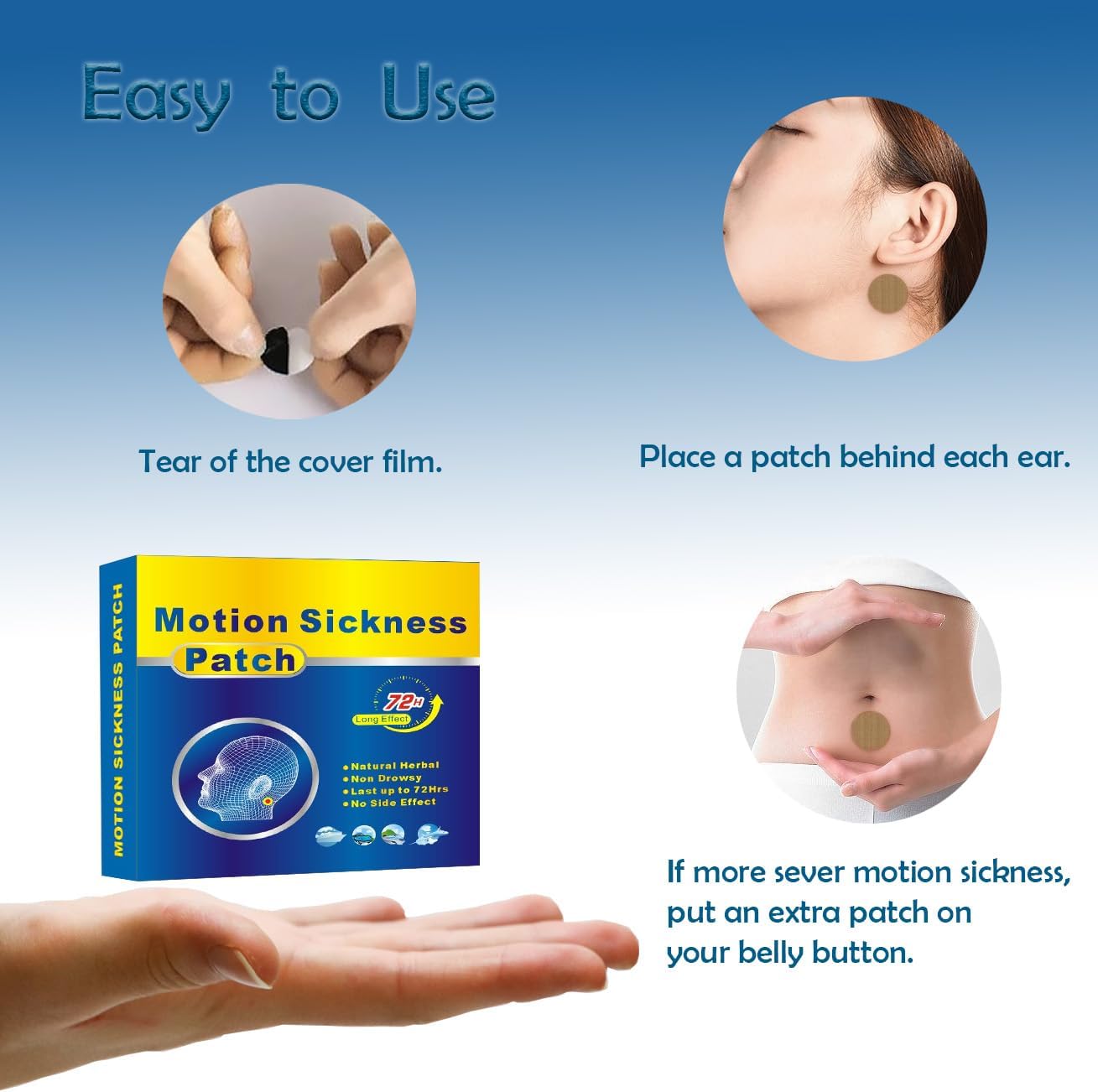 暈車貼伴您旅途愉快! 1. 取出適量暈車貼,撕開白色塑膠薄膜。 2. 分別在每隻耳朵後面貼一片。 3. 或在肚臍貼一片。