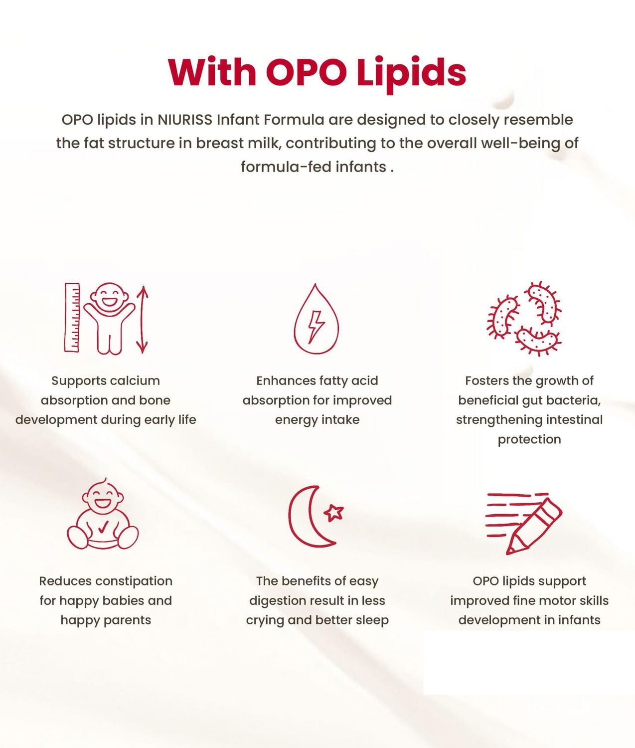NIURISS 以母乳此黃金標準為靈感,並融入嬰兒營養領域的最新進展。我們是加拿大第一個添加 OPO 脂質的配方奶粉,這種脂質與母乳的脂肪結構非常相似。自 1995 年以來,經過臨床驗證,OPO 脂質有助於更好地吸收鈣質、改善能量攝取、促進腸道有益菌生長並減少便秘。
