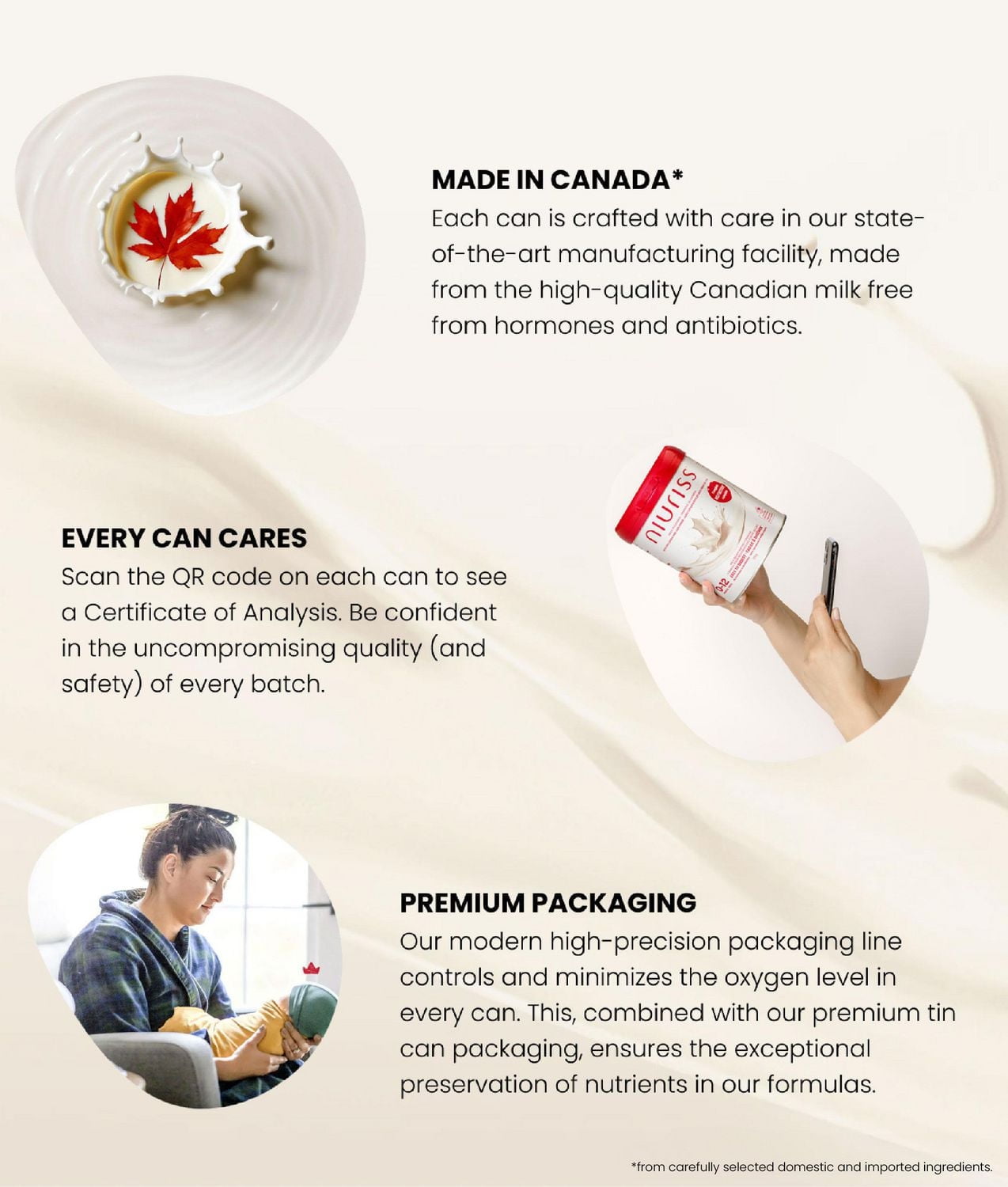 NIURISS 嬰兒配方奶粉產自加拿大。採用加拿大本地優質牛奶,並加入精心挑選的進口原料,確保每一罐都符合加拿大嚴格的安全標準。